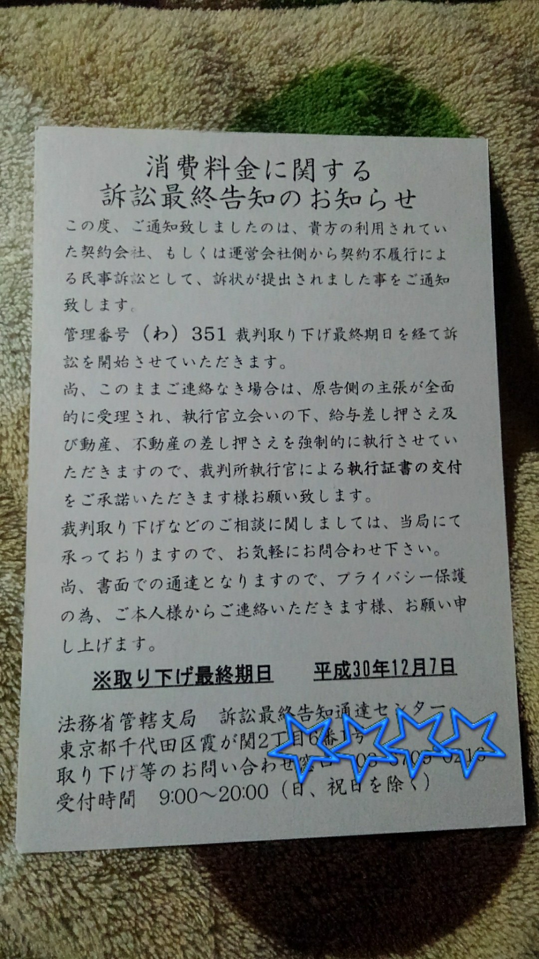 「消費料金に関する訴訟最終告知のお知らせ」